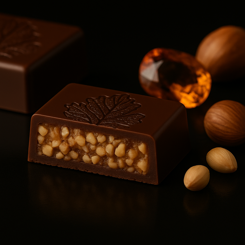Golden milk chocolate with roasted hazelnut pieces — rich, warm, and timeless like topaz.